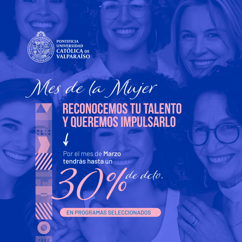 En el marco del mes de la mujer, la Pontificia Universidad Católica de Valparaíso, a través de su Dirección de Formación Continua, lanzó la campaña “Marzo: Mujeres que Lideran”, iniciativa que contempla un beneficio especial acumulable en diplomados, cursos y postítulos seleccionados durante todo el mes de marzo.
